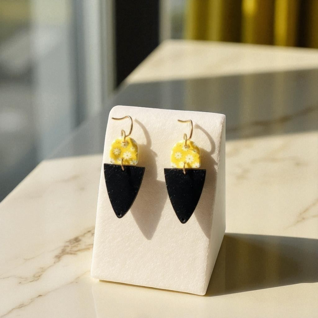 Add a touch of whimsy to your look with these playful layered daisy dangle earrings. Handmade from rich black acrylic, each flower features delicate layers that catch the light and sway with your every move. Perfect for brightening up any outfit with a fun, floral flair!