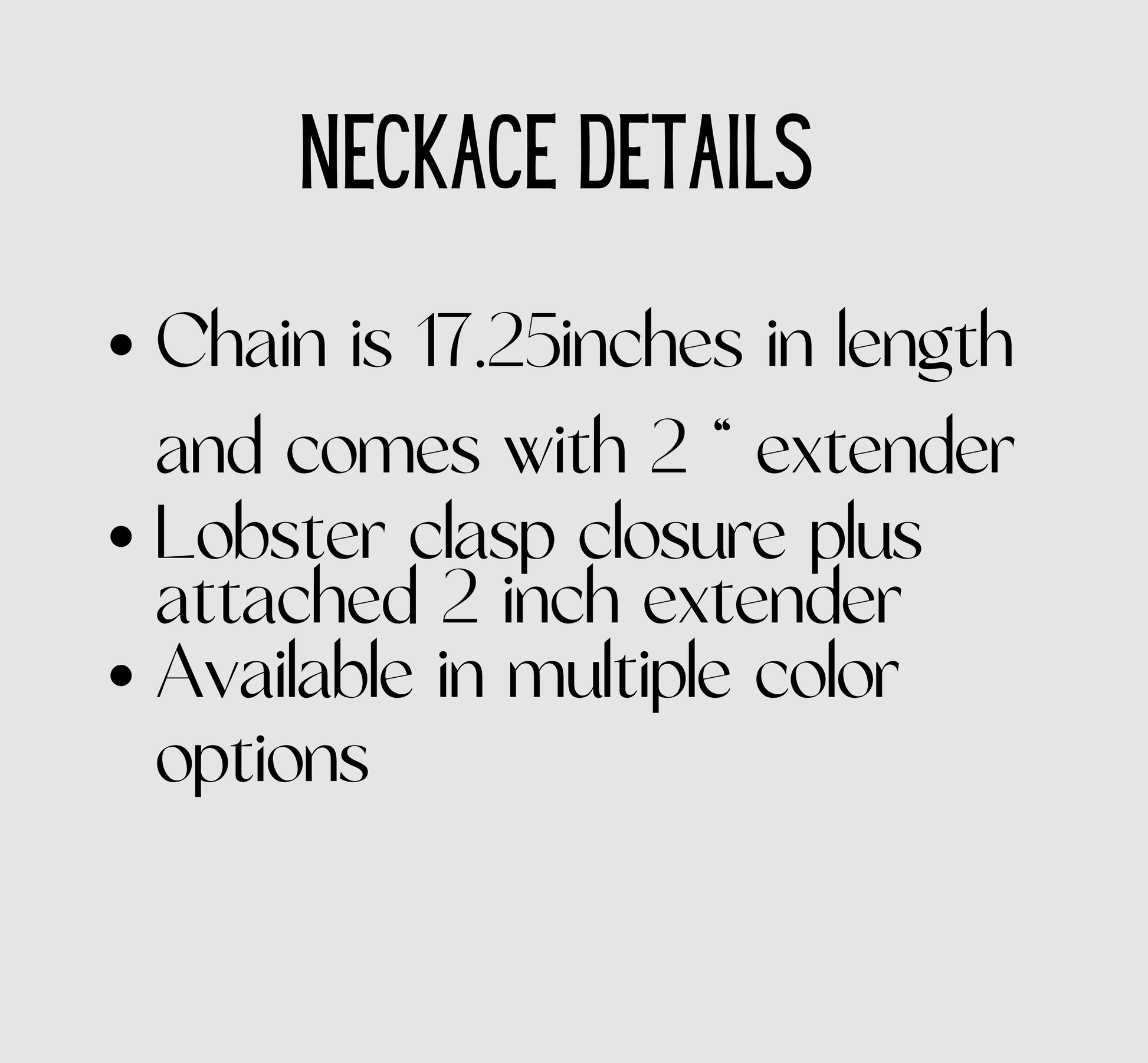 - Chain Length: 45cm + 5cm extender (approx. 17.25” + 2”)
